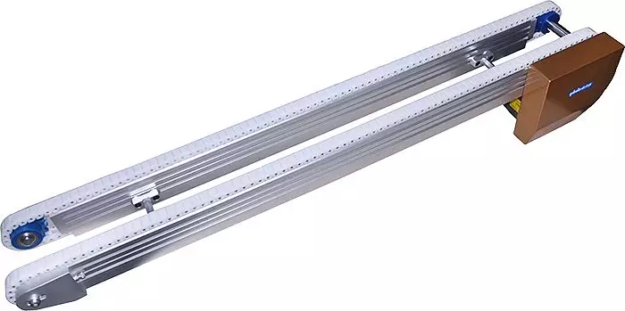 主要類型著重在鏈條的類型上,鏈條可增加頂板、側(cè)向連接件等。利用雙列塑料鏈條輸送夾具下料,有摩擦力小,耐用,易維護(hù),噪音小等特點(diǎn)